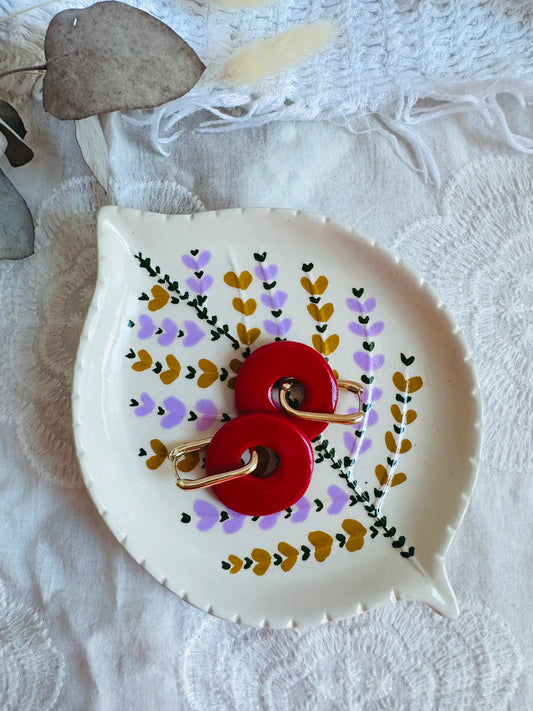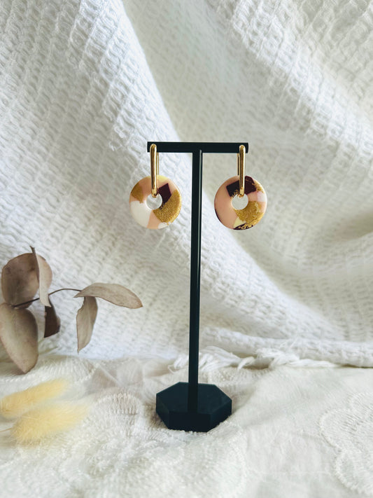 Pendiente donut grande, aro alargado, tono blanco, beige, granate y dorado.