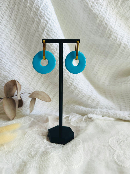 Pendiente donut grande, aro alargado, azul bebé con toques dorados.