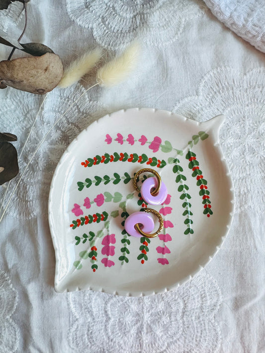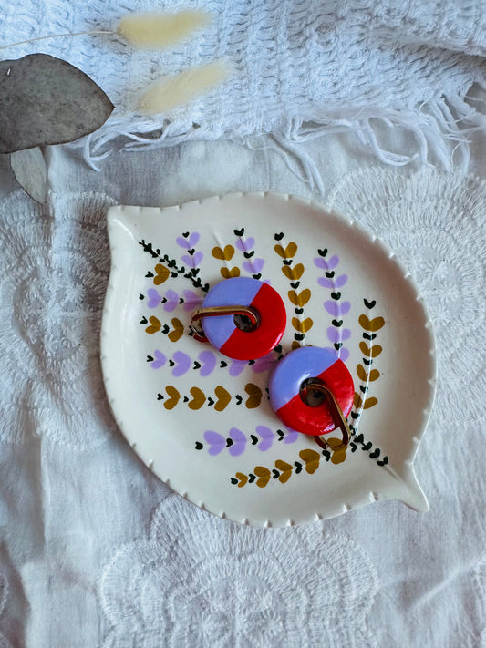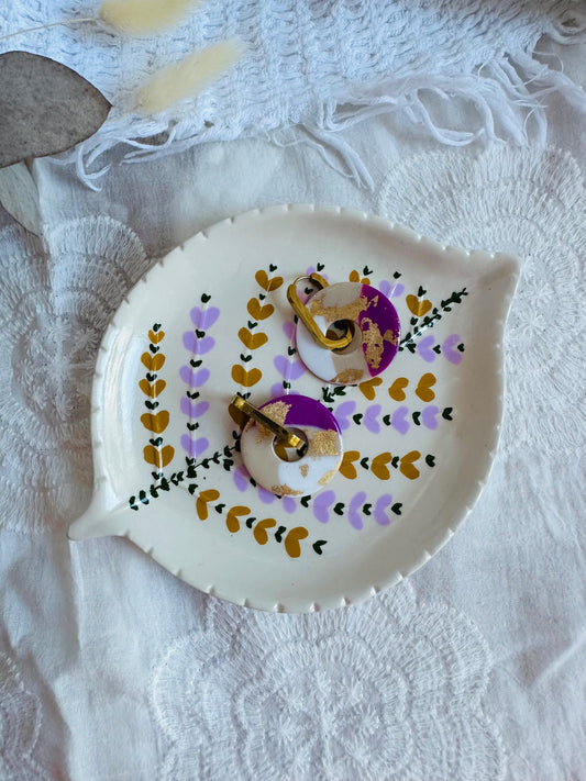 Pendiente donut grande, aro alargado, morado, blanco y beige, con toques dorados.