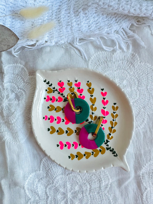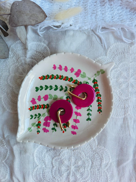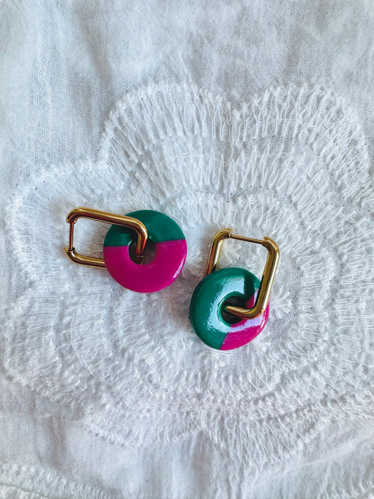 Pendiente donut mediano con aro "cuadrado", en rosa y verde.