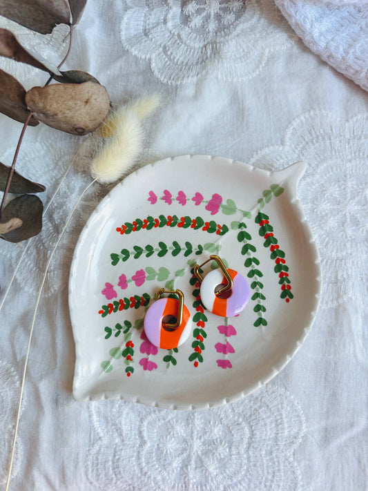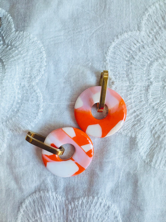 Pendiente donut grande, aro alargado, tono naranja, blanco y rosado.
