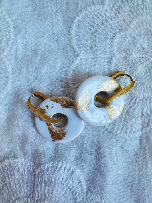Pendiente donut grande, aro alargado, blanco con toques dorados.
