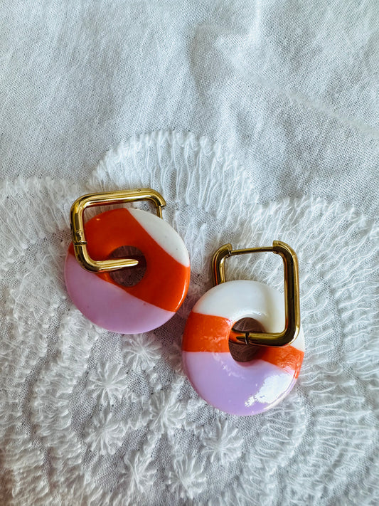 Pendiente donut mediano con aro "cuadrado", en blanco naranja y rosa bebé.