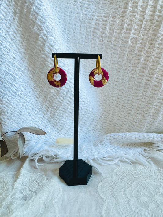 Pendiente donut mediano con aro, en tono lila , rojo y toques dorados.