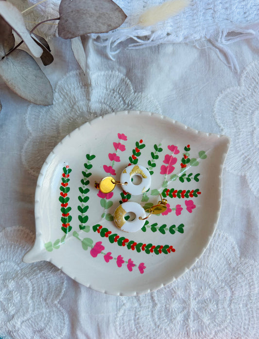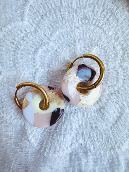 Pendiente donut mediano con aro, en tono blanco, beige, granate y toques dorados.