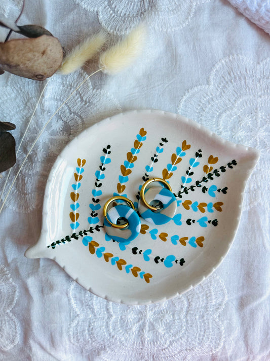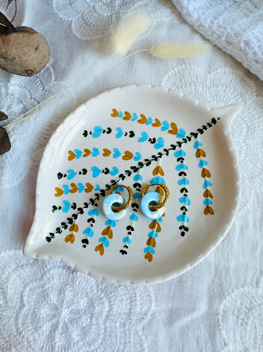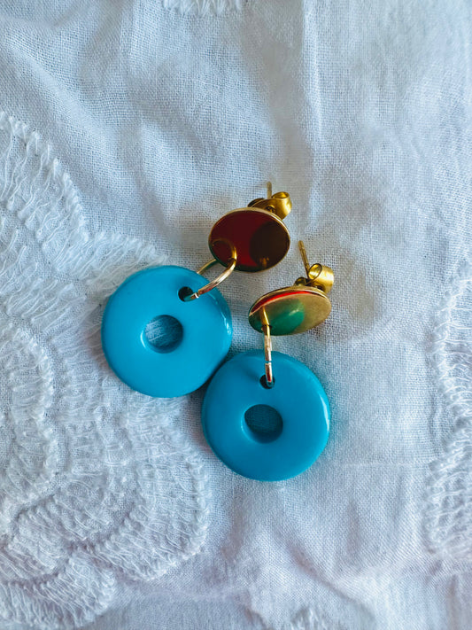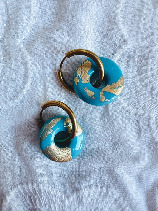 Pendiente donut mediano con aro, en tono azulón con toques dorados.