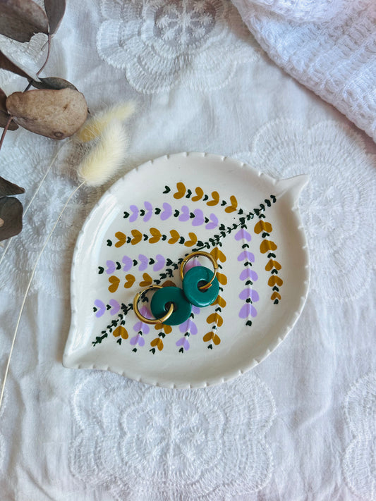 Pendiente donut pequeño con aro mini, en color azul, morado y toques dorados.