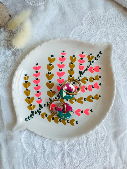 Pendiente donut mediano con aro, en verde, rosa y con toques dorados.