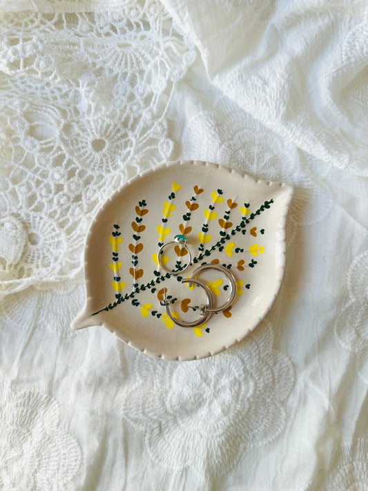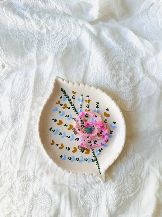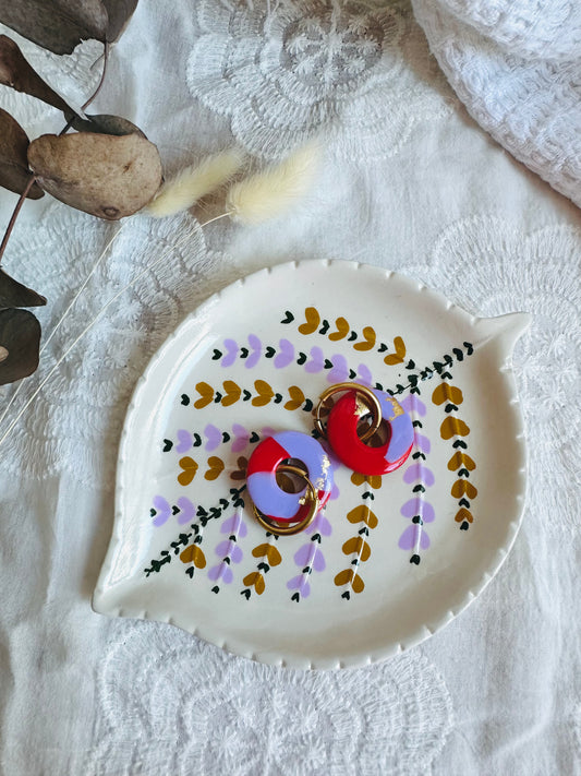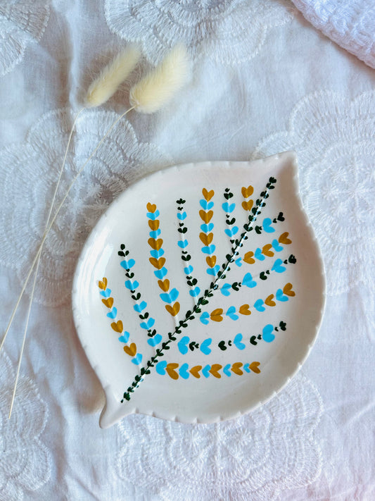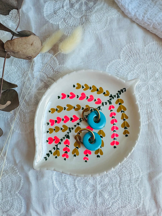 Estas hojitas de cerámica están pintadas a mano, cada una es diferente y son el complemento perfecto para dejar tus pendientes y otras joyitas.