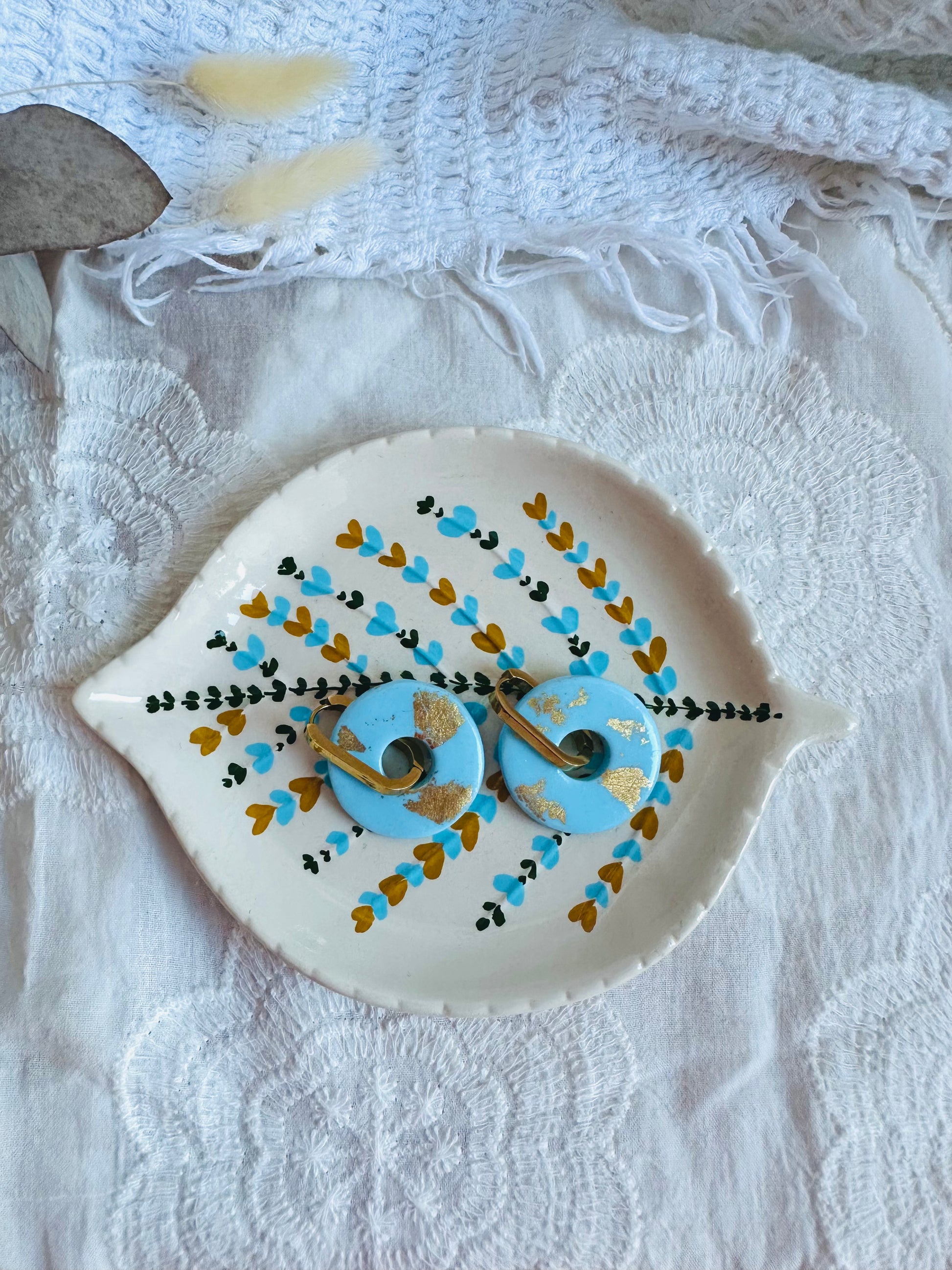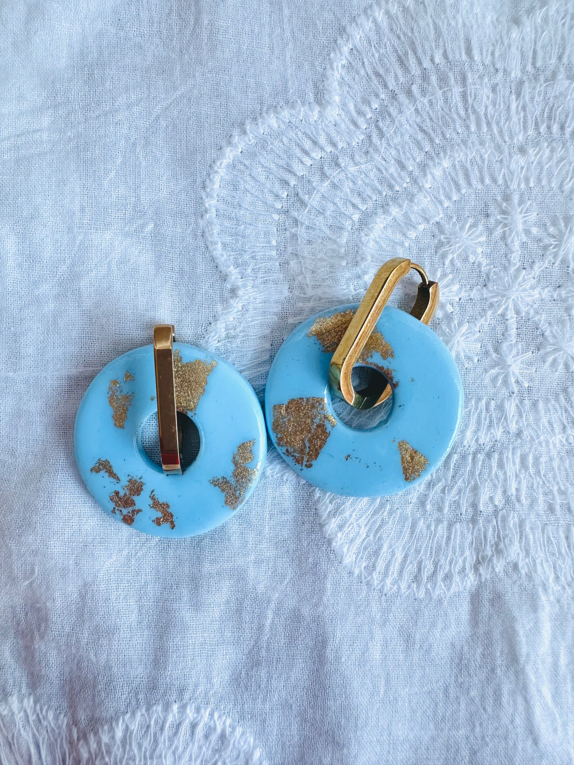 Pendiente donut grande, aro alargado, azul bebé con toques dorados.